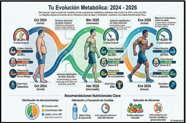 El paso de un nivel “Deportivo” a uno “Atlético/Elite” implica que su metabolismo es ahora mucho más eficiente. Esto se evidencia en la relación entre su peso y su composición de tejido, donde a pesar de pesar más en 2026 (71.95 Kg) que en 2024 (70 Kg), su scoring es mucho mejor porque ese peso está compuesto por más músculo y mucha menos grasa. Conclusión